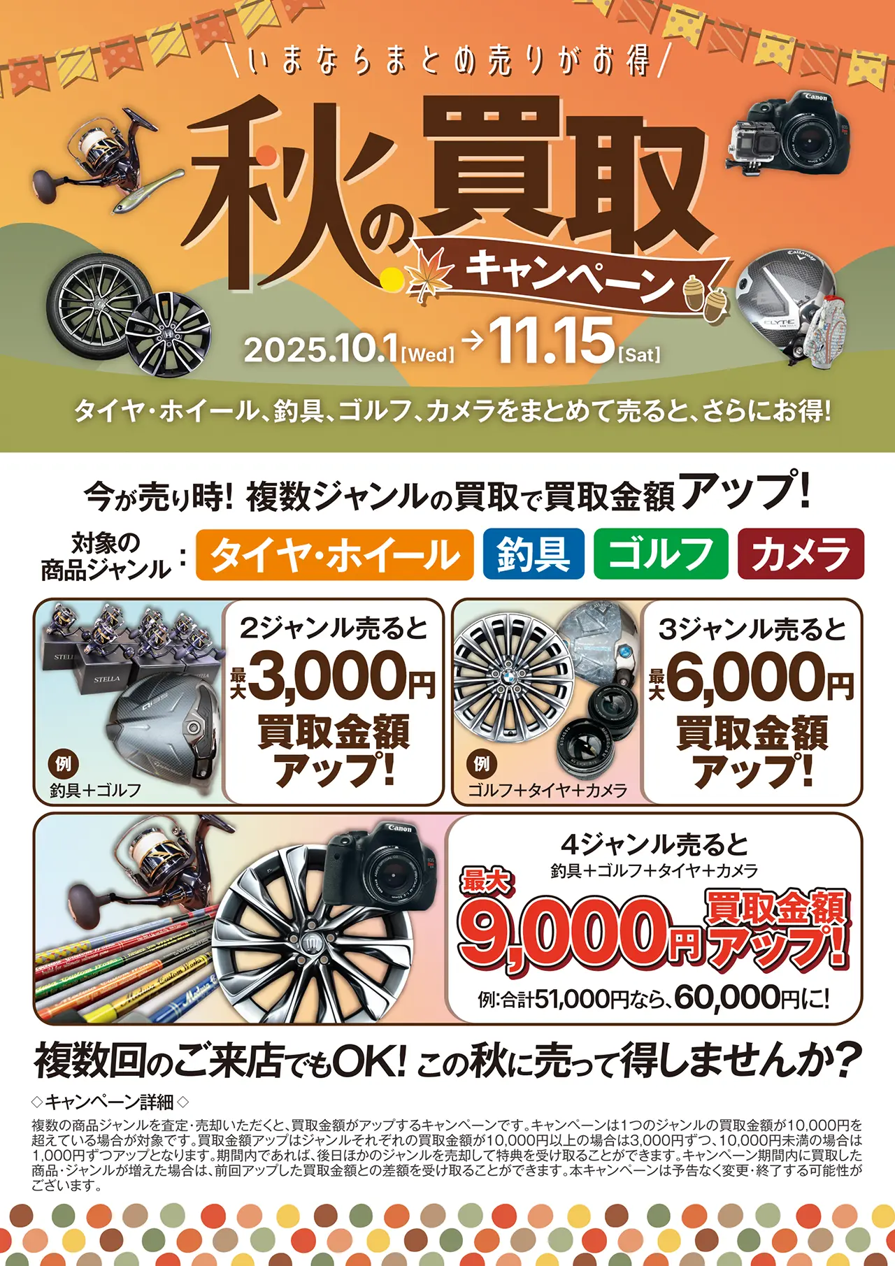 【店舗キャンペーン】複数ジャンルを売ると買取金額アップ! 秋の買取キャンペーン開催!